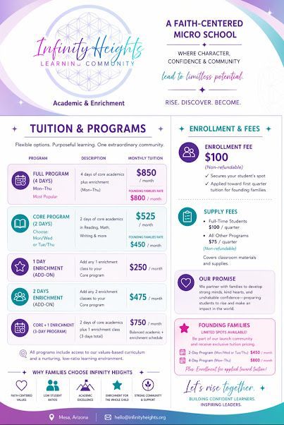 The complete Infinity Heights experience! Choose Enrichment only, Core only, or get a full structured Microschool 4 days a week. We provide a hands-on, safe, and structured environment with the feel of homeschooling away from home. We will take core of the schoolwork so you can have more time with your family at home.